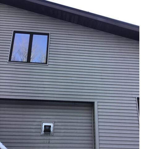 We designed and installed a radon mitigation system that worked with the home’s existing conditions. The piping was routed in the same corner and exited to the right toward the outdoor stairs, avoiding the electrical service area. The fan was mounted on the gable wall next to the service, staying on the same plane for a clean exterior appearance.